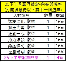 Step3: 參加 [生存模式] 對戰完成獲得 [25下半季奪冠禮盒],打開禮盒獲得活動道具