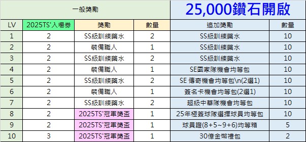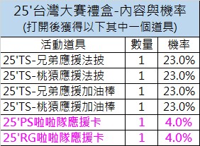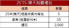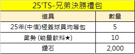 期限內收集以上道具,將可至兌換所兌換本次主題活動獎勵 ( 25TS'台灣大賽禮包、25年兄弟、樂天(+8)簽名卡等豪禮 }
