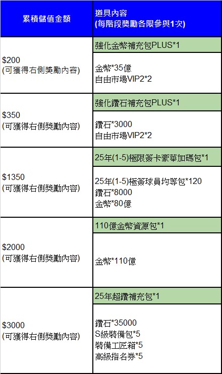 ※本活動僅限於官網WEB儲值「累積金額」獲得,使用App Store或Google電子錢包於遊戲內消費不在本活動獎勵範圍
