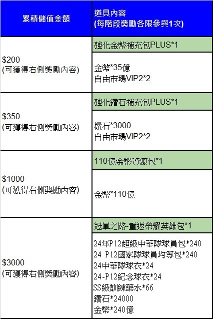 ※本活動僅限於官網WEB儲值「累積金額」獲得,使用App Store或Google電子錢包於遊戲內消費不在本活動獎勵範圍